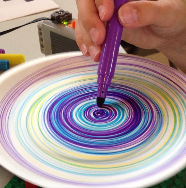 Time to take it apart and build the second project–which was a stand for spiral art.  It spun a plate in circles while you held a marker in place.  Really cool art resulted.