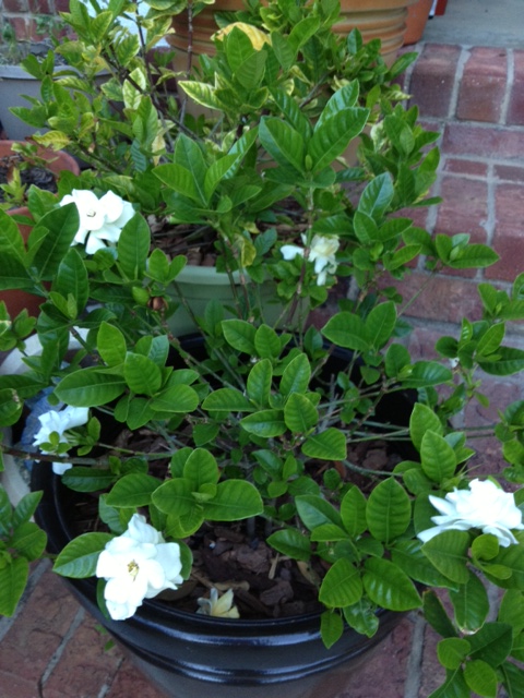 Whenever I have stepped outside today I’ve been greeted by the sweet smell of gardenia. It was sent to me by a dear friend who is overseas to remember my Mama. After a few days its leaves started turning colors. I panicked. Another good friend who is a Master Gardener told me to call the company. They promptly sent me another one. And the same thing happened. Y’all, I’m not like my Master Gardener friend, but I don’t usually kill every plant I get. She took them under her loving care and just look. Gorgeous. The first one has recuperated from a bad case of being rootbound, and the second one is on its way back. (for the record, rootbound–not my fault) Aren’t they beautiful? They just fill me with peace. And that smell…..second only to a tea olive. I am thankful for my friend who sent them, and for my friend who used her gifts and talents (she is THE Mrs. Greenthumb) generously and rescued these babies. And this is not the first time she has saved the day–and a plant or two. Thank y’all–I think of you both everytime I see those beautiful blooms and green leaves.