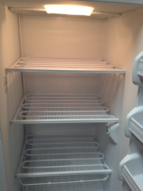 So it’s time to go and get my peaches and put them up. But my freezer. It’s not so good. It has needed defrosting for oh, let’s say, about a YEAR. The ice takes up more space than the food, and the food in there was starting to be frozen together. This does not work so well.