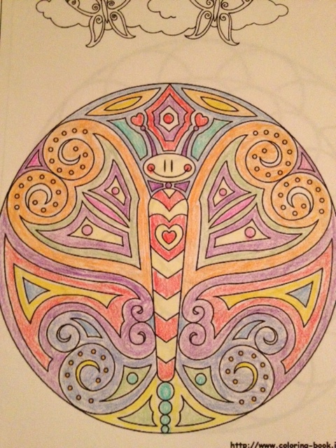 This morning I printed out several different mandalas for us each to choose and color. When I arrived, there were not many women. So it was that the three of us sat and talked. Both had been before so we were able to jump right in. When it came time to choose a mandala and medium, they both chose markers. One chose the butterfly and another chose the circular pattern. I really liked the butterfly myself, so I chose it. I enjoy colored pencils so I used those.