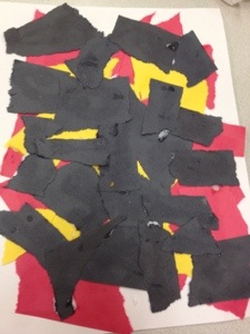 In preparation for our art pieces, we took strips of construction paper and tore them into bits, focusing on tearing up the things that we had a hard time letting go of–thoughts, control, words, pain, emotions, memories, darkness, sadness, brokenness. As we tore, we tried to really think about letting go of these things that had such a hold on us.