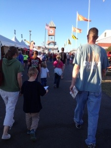 I love that you can get so many varieties of food. We found one place there that we know is safe for our food allergy child, so we are able to relax and eat and enjoy the sights and sounds of the Fair. Among the supper fare for everyone was gyros, pizza, chicken sandwiches, blooming onion, and roasted ear of corn (mine–look forward to it all year!). We sat as the sun started settling a bit and the breeze stirred. Music flowed around us as the same singer that entertained us last year sang oldies but goodies.