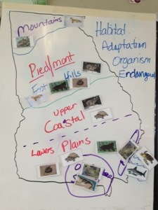 They have started holding classes for homeschool students once a month. We decided to try it last month and we were hooked (ha, no pun intended–seriously, just caught it in editing). So this past Friday was our second class with Miss Clare, the Center Educator. She taught about Habitats. To begin with each child took a card with an animal on it. Miss Clare asked each one to stick them on the map of Georgia in the habitat they thought best suited their animal.