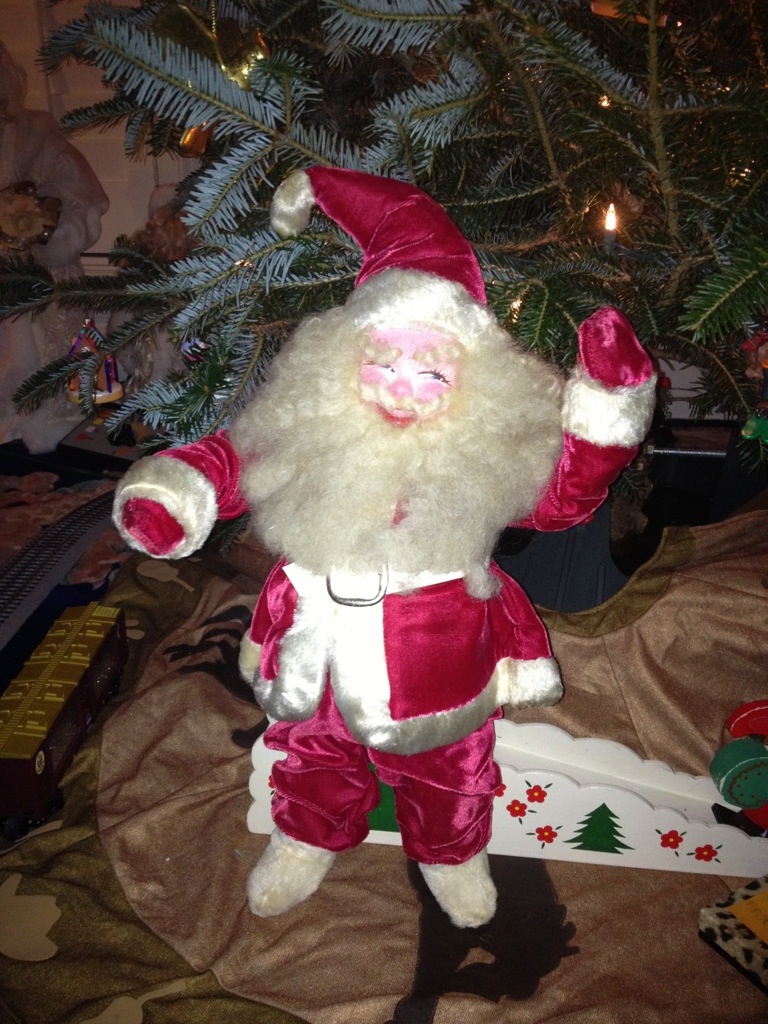 I grew up with this Santa standing around the tree, on top of the piano, and next to the bookcase over the years. As far back as I can remember. I think Mama had it when she was small, but I can’t be sure now. The story as I recall it is that her Daddy got it from a store display that was being taken down at a store that he worked for. He’s a beautiful Santa. Red velvety suit and those cheeks and that beard. I was always a little bit in awe of him growing up. He’s just perfect. At least to me.