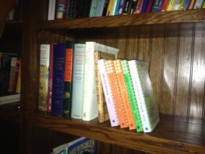 Aub, as she surveyed the nearly done shelving of our “Junior Fiction” books, said, “I feel really vulnerable and out there with all of these books together like this for anyone to see.” She touched one set of books and then another, “These were my third grade world…..these I loved when I was in the fifth grade.” And then there’s the Harry Potter series. She and Harry grew up together think. I know what she means. As I shelved some of the oldest ones we have, I remembered my own fifth grade year. And high school. And the book Mama and Daddy bought for me when I turned six. All there.