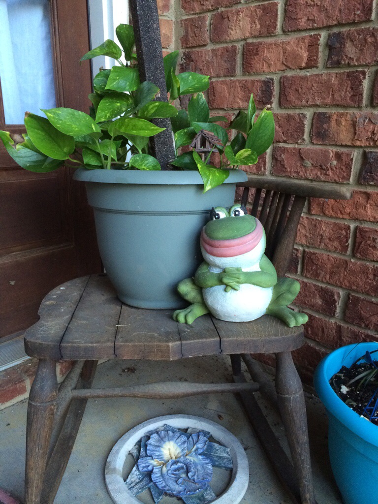 This plant has never looked so happy. Neither has Madam Frog, as long as the cats don’t knock her off. There’s a little fairy wishing well in the pot if you look closely. I love this old broken rocker turned plantstand. I don’t know if it’s too tacky to be quaint by normal standards, but around here we embrace the brokenness. And the crazy. And we parade them all on our front porch. Literally.