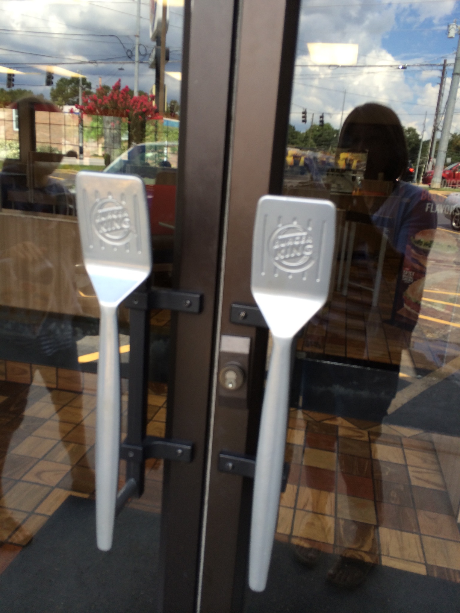 On our way back to get the Fella, we stopped to get a bite as we were all feeling a little peckish. We made another pit stop. (I’m sorry, y’all, but these are of the utmost importance for the under 10 and over 40 crowd–which was pretty much all of us.) We admired the cleverly made door handles