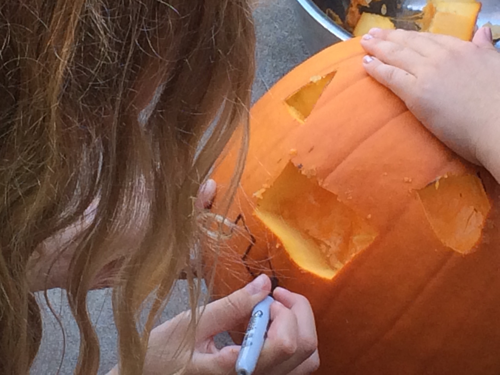 After scooping out the innards, something she let her friend help her with, she was ready to design the face. She drew triangles on, again with the Sharpie, which in hindsight might not have been the best idea. When one was a little higher and bigger than the other, she tried to redraw it, not realizing at first that redrawing wouldn’t help. The lines would still be there. Her friend made one suggestion after the other. I was about to interject again, when my girl said, “No, it’s okay, thanks though. I like the way it looks. They eyes will just look a little creepier and spookier this way.”