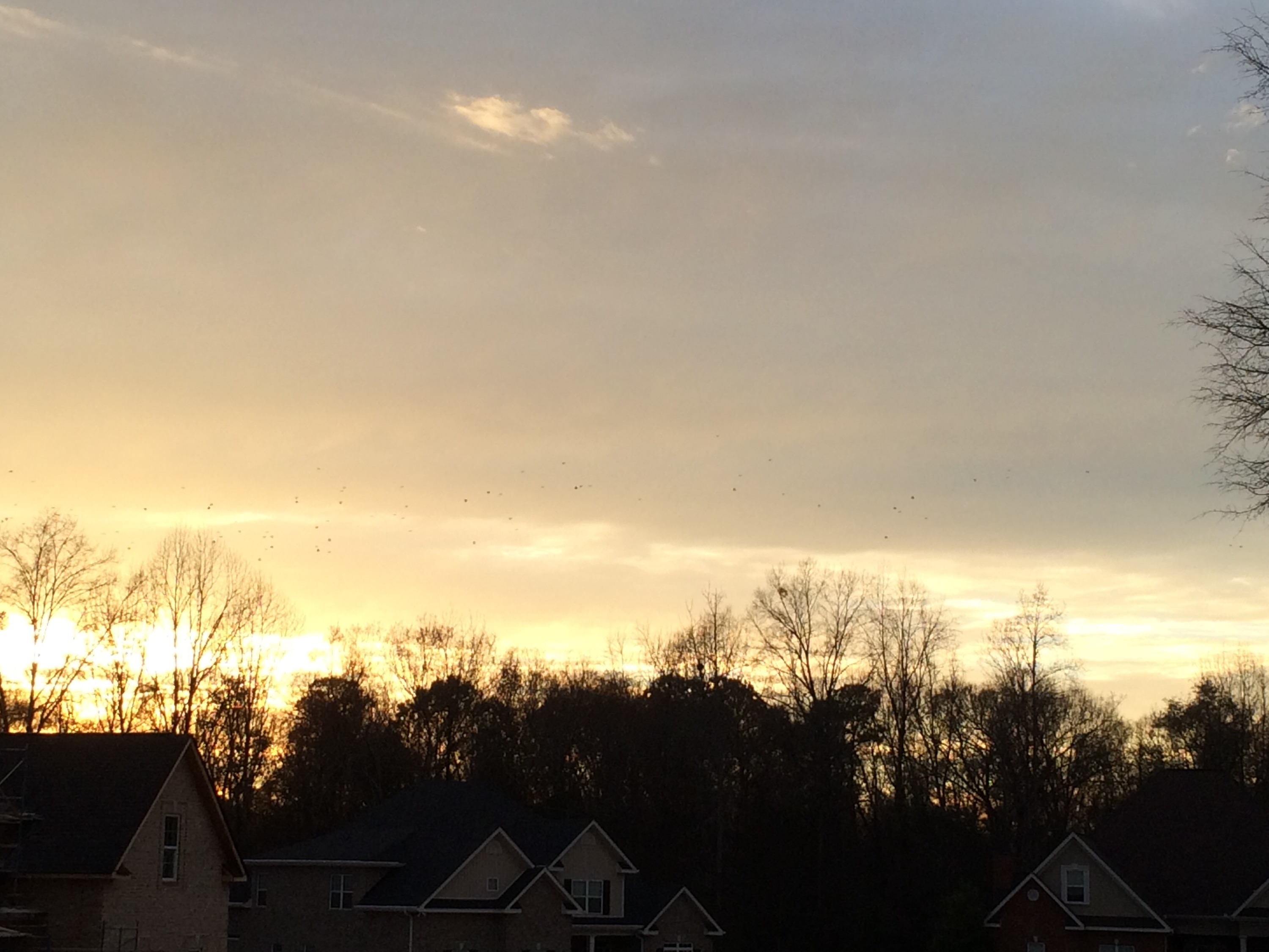 Those blackbirds flying over in a pattern that was beautiful. They waved and wound their way through the skies overhead, their darkness in striking contrast to the brilliance of the soft and lovely sunset.