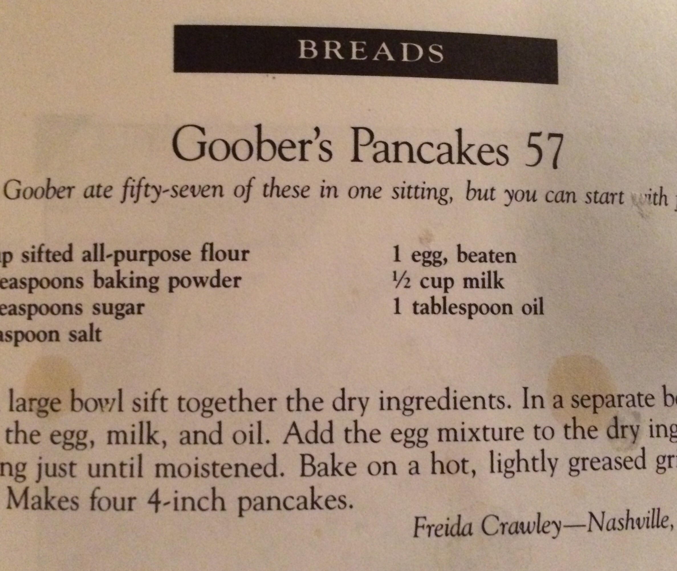 So in all of those thoughts, I thought about the Lucky Charms as comfort food, and since I was too–I’ll just say it–lazy to go to the store this afternoon, I made pancakes. Goober’s Pancakes 57 from Aunt Bee’s Mayberry Cookbook. They are legendary in our house. Not because they’re phenomenal or anything, but because my crew knows Goober’s story.