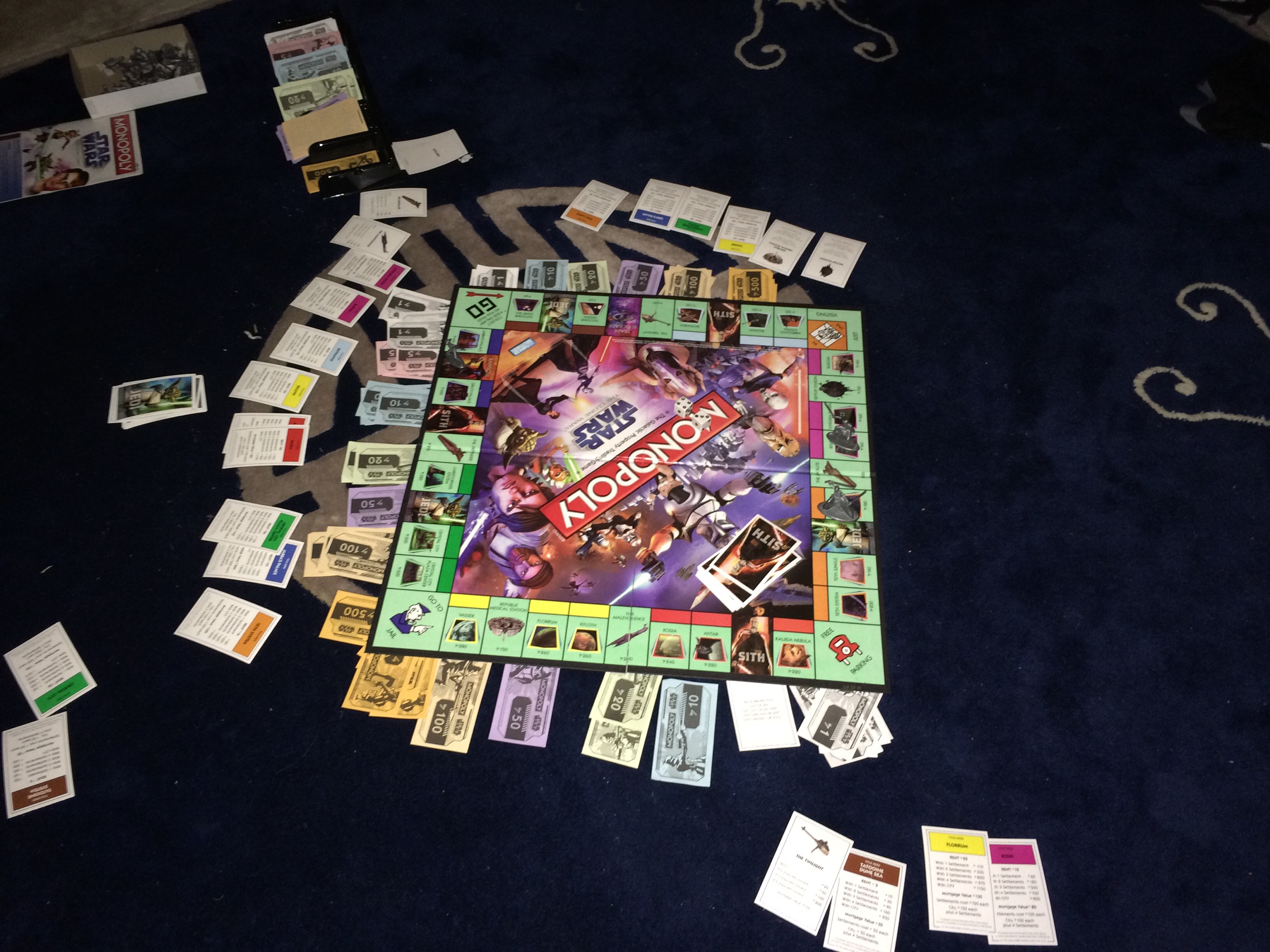 We found a Star Wars Monopoly game at the GW Boutique Friday. Brand new, never opened. We picked it up, because Cooter is the biggest Star Wars fan ever. And Aub likes to play monopoly. She’s really good about playing games with the littles. I know, she gets that from Mama. So they had a marathon game going all weekend, reminiscent of the games we used to have going at Granny’s–me and the cousins way so long ago.