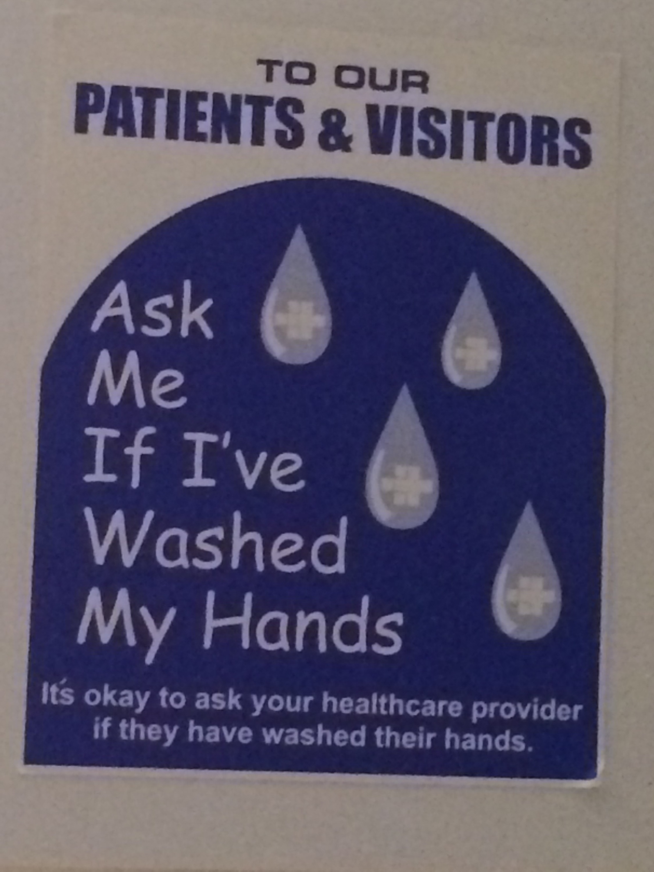 It also wasn’t telling Aub that I was DEFINITELY going to ask the doctor if he had washed his hands–I have done it before when I had a three-month old Cooter in there for what they suspected was pneumonia. Aub told me not to, and when I pointed to the sign and said, “It’s okay,” she replied quite firmly, “It’s okay…..but not recommended.”