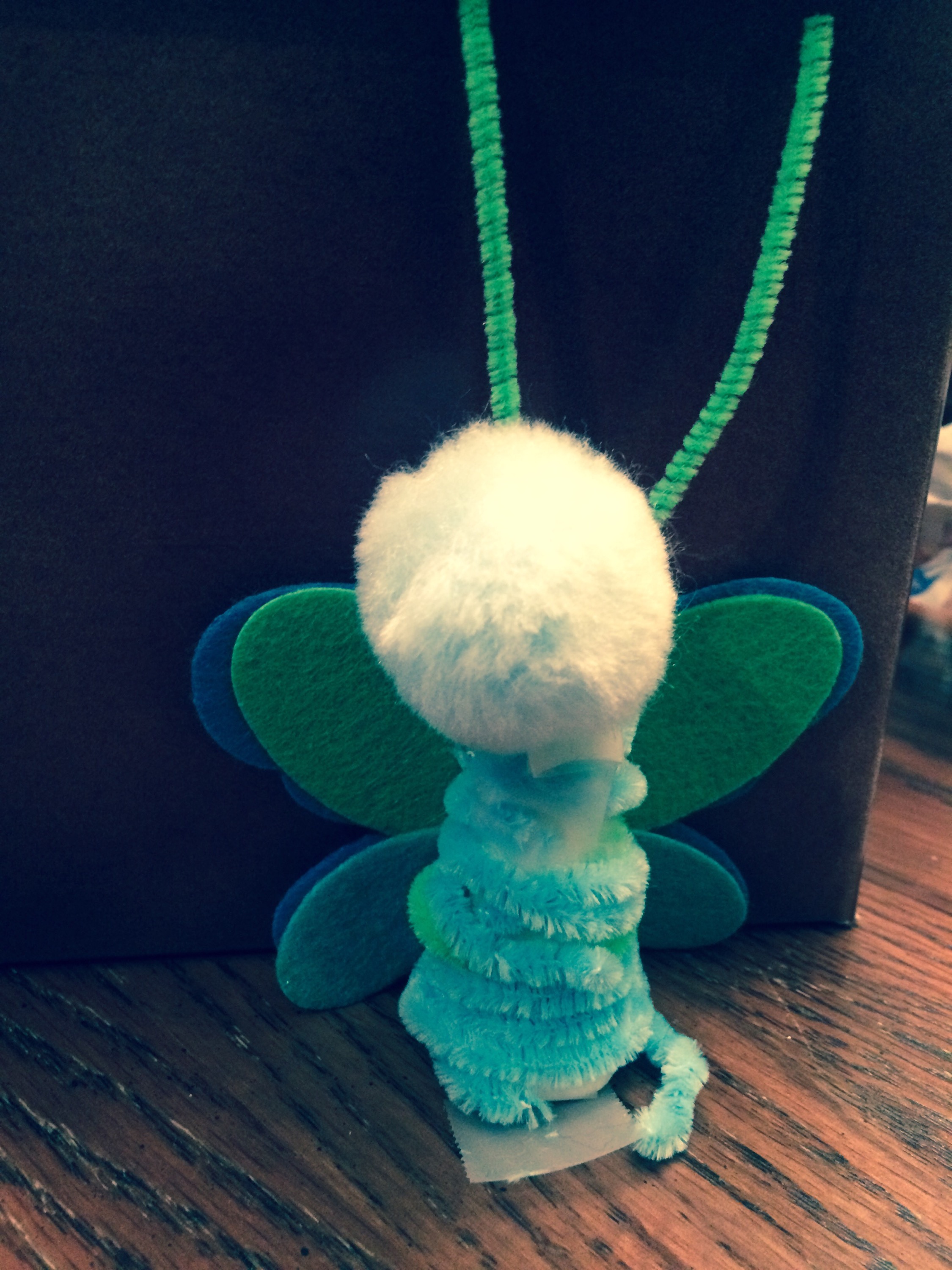 And then there was Cooter. After coming up with a rather interesting and asymmetrical (law help my OCD) design on his wings, he gave up trying to attach them to the body of the butterfly puppet. Instead of using one of the big pompoms for a head, he stuck a little one on the top and said, “That’s its neck. You can’t see its head.” And then I saw the wheels turning in his head.