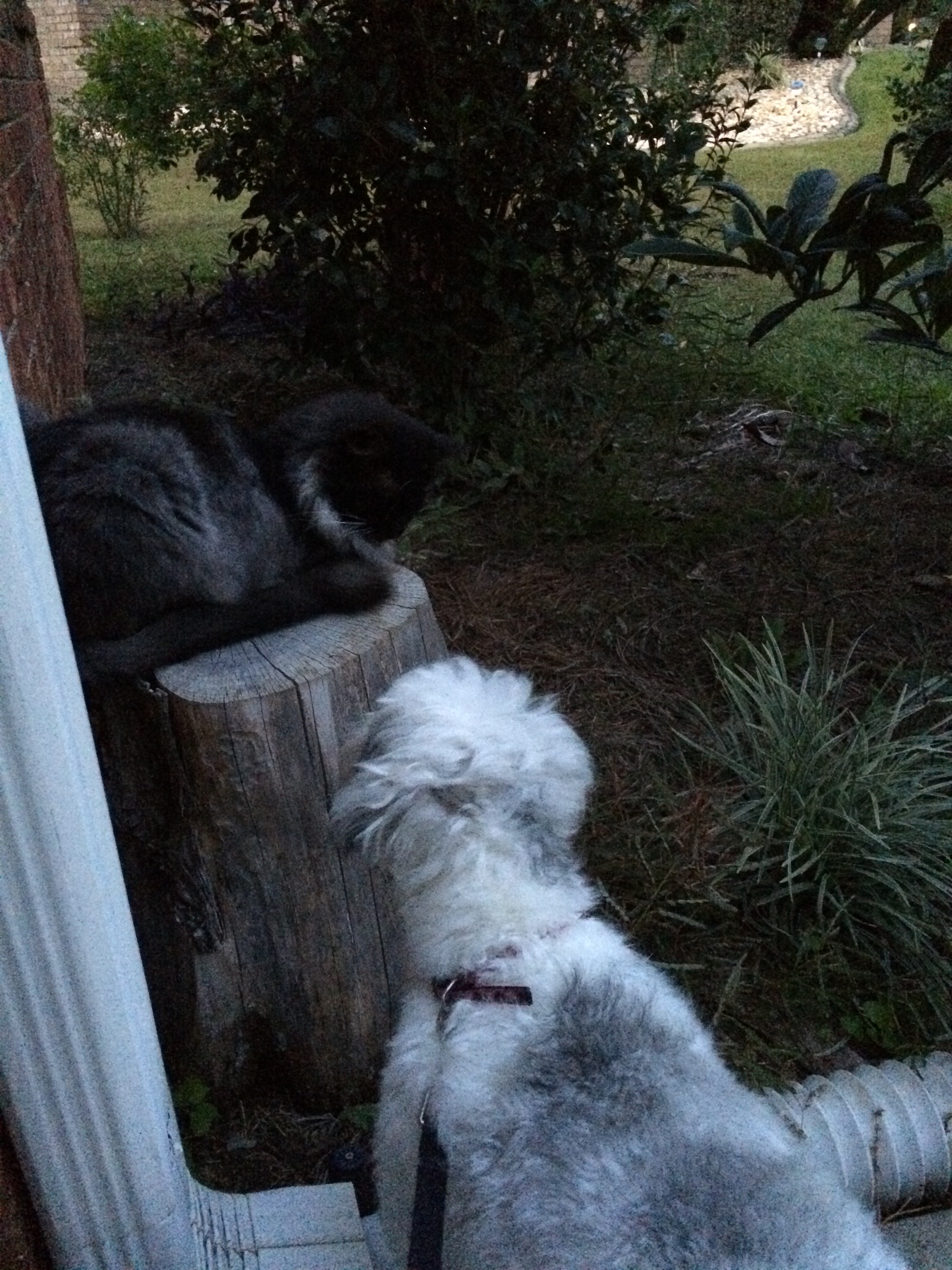 As we sat there and she did what she does best, sniffed everything in sight, our new cat who adopted us came up to say hello. She is beautiful and is about as social as any cat can be, but she has her moments like all cats. We have given her the moniker of “Luvvy” as in Mrs. Howell (from Gilligan’s Island, y’all) because she has this “fur muff” around her neck. Very luxurious. Miss Sophie finds her fascinating and announces her presence whenever she notices the feline through the window–sitting on the outside windowsill, sunning on the back porch, holding court on the front porch, wherever.